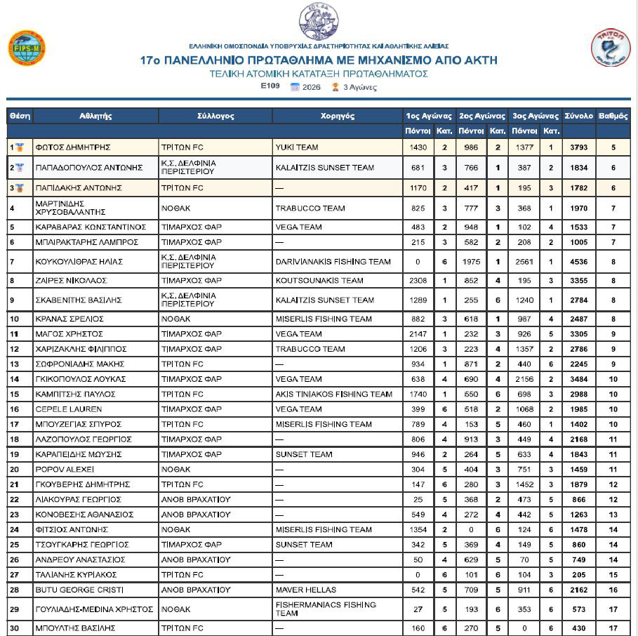 Ολοκληρώθηκε το 17ο Πανελλήνιο Πρωτάθλημα Αλιείας από τη ακτή μετά από 3 αγωνιστικές.