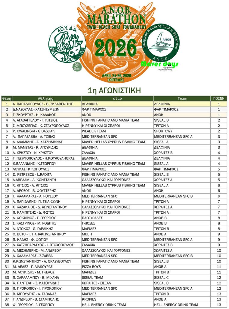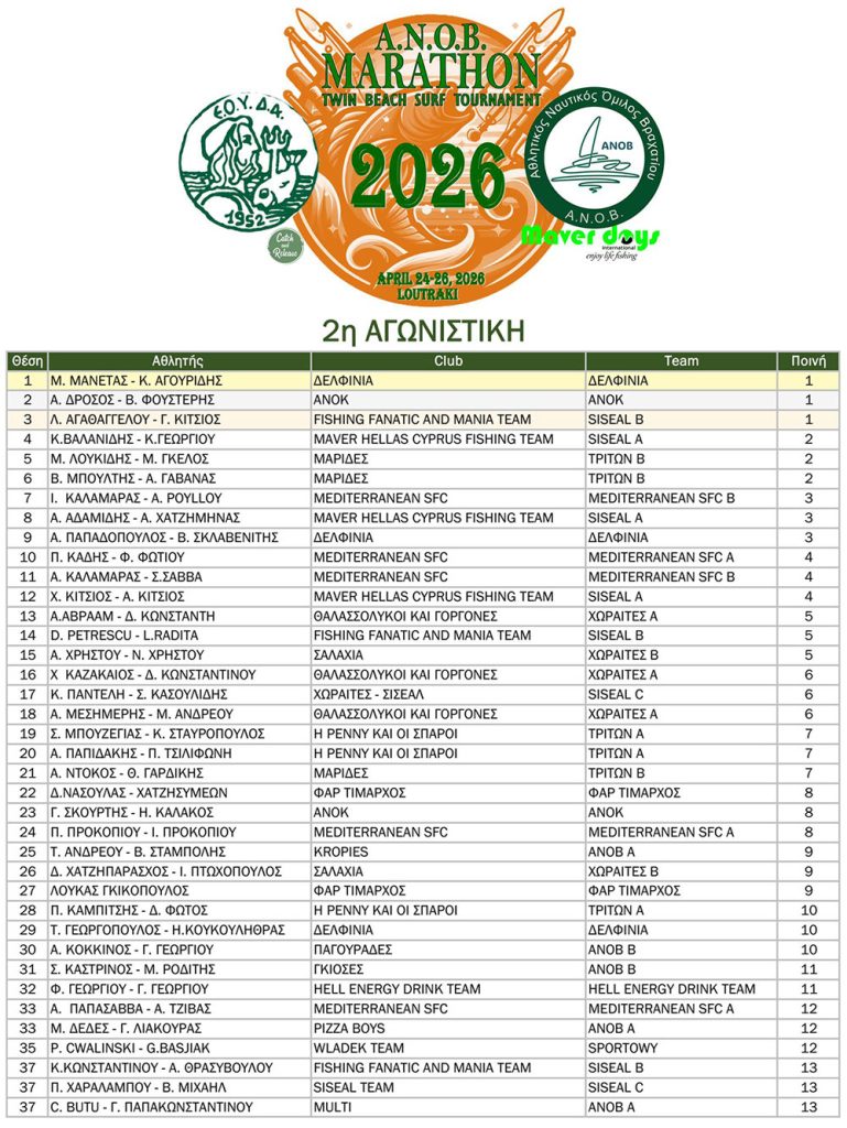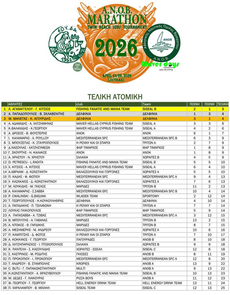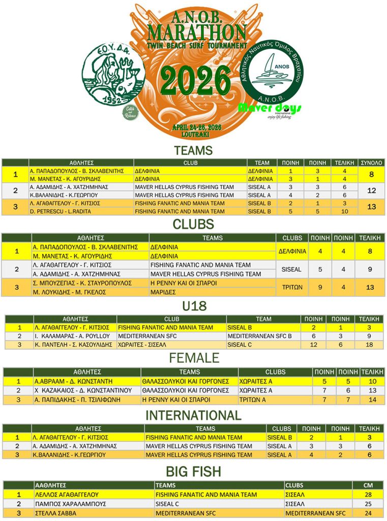 Διεθνής Αγώνας Αθλητικής Αλιείας MARATHON 2026: Τελικά Αποτελέσματα